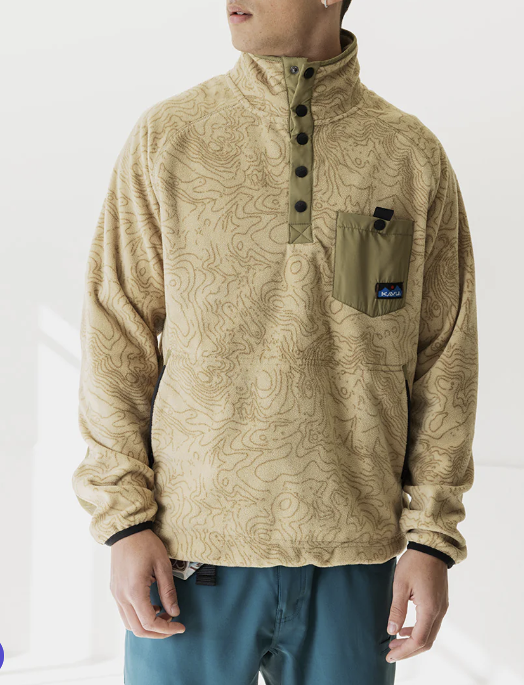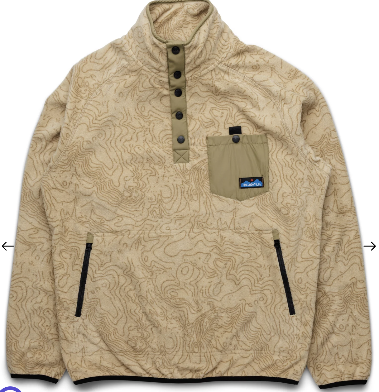 Casual fit, half placket mock neck fleece pullover with logo snap closure, accent fabric on top collar edge, placket and single chest pocket with logo snap closure, reinforced accent fabric overlay at elbows, jersey lined zip hand pockets, elastic binding on sleeve cuffs and bottom opening.